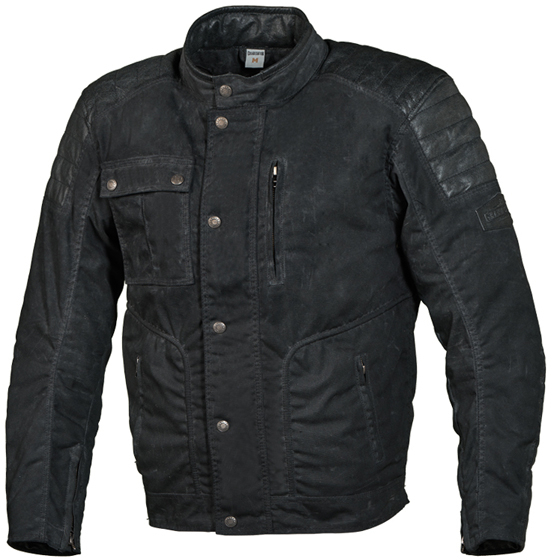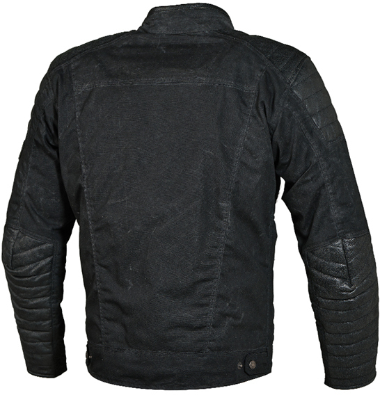 Giacca da uomo in tessuto con dettaglio in pelle su spalle e braccia.