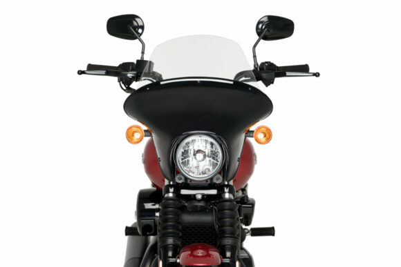 Design turistico, interamente in robusto ABS con finitura nera lucida, parabrezza in RMMA, รจ progettato per adattarsi perfettamente alla tua Sportster, senza alcuna modifica.